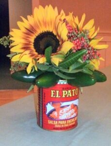 Another way to incorporate a touch of fun is by using different cans with colorful logos. I love spicy food, and with a few of these jalapeno embellished large cans of enchilada sauce, my holiday table is complete!